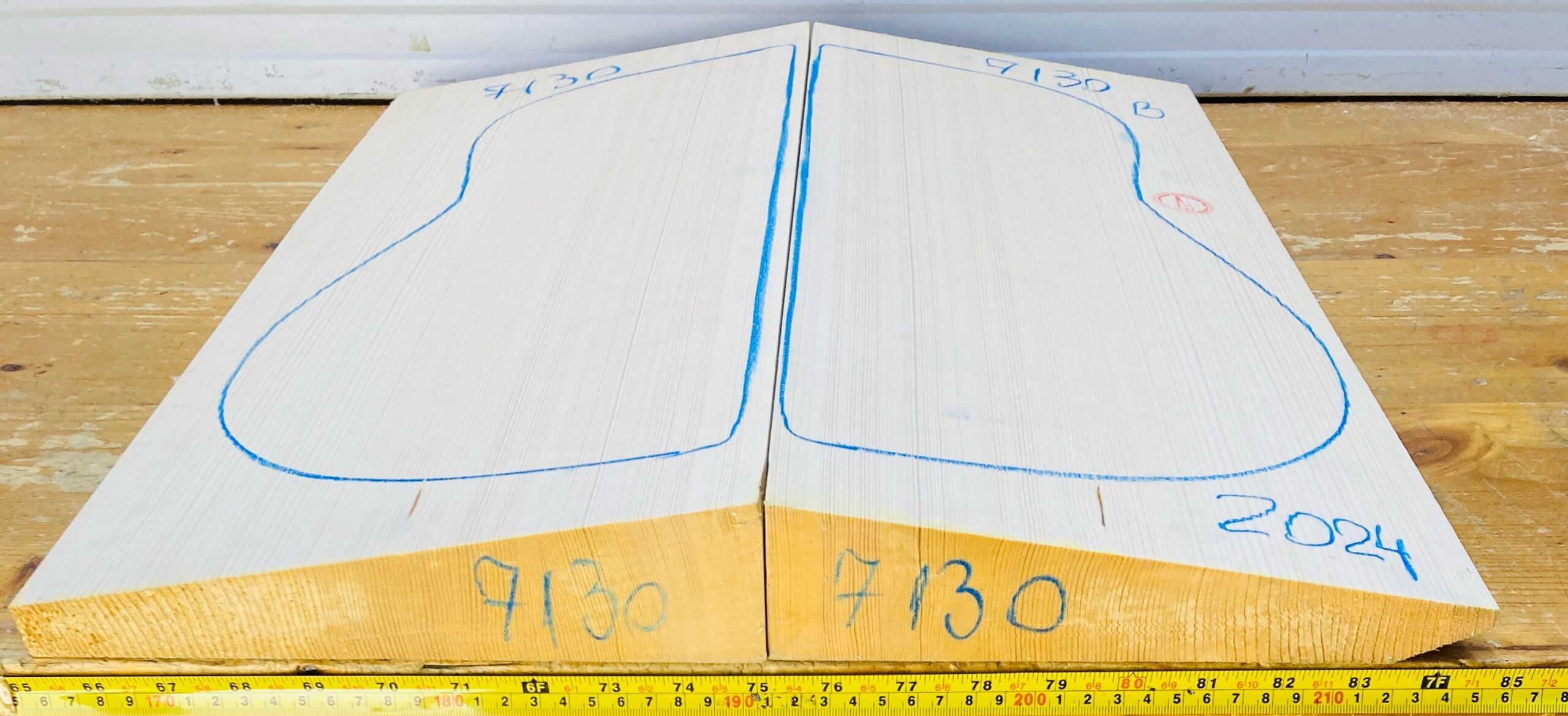 There is a set of two bookmatched, quartersawn halves. Each half is minimum 23″ x 9″ (600 mm x 230 mm) and tapers from approximately 0.43″ to 1.25″ at the joint edge (11 mm to 35 mm) thickness